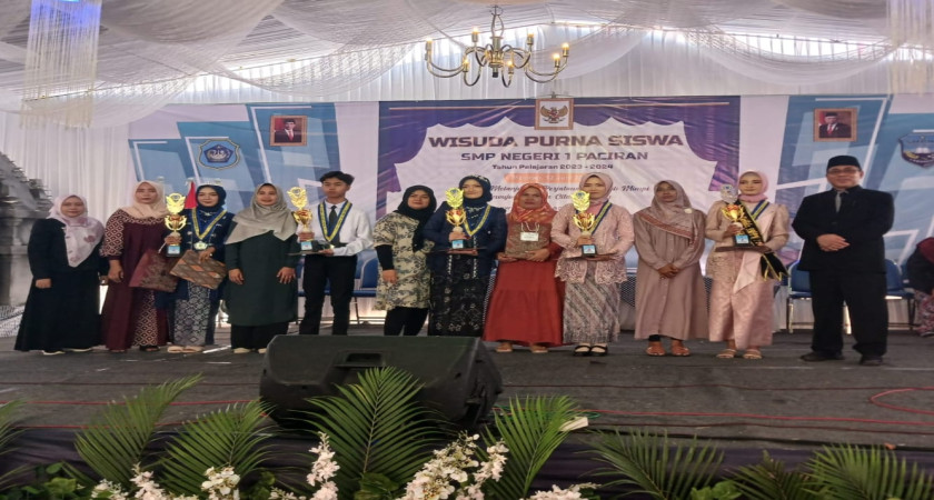 Paciran - Kebahagian terpancar di wajah para siswa kelas IX SMP Negeri 1 Paciran pada hari Rabu tanggal 12 Juni 2024 di selenggarakan Purna Siswa Kelas IX tahun pelajran 2023/2024. Sebelum prosesi wisuda banyak sekali penampilan karya seni dari siswa siswi SMP Negeri 1 Paciran khususnya dari kelas VII dan VIII sebagai bentuk penghormatan untuk kakak kelasnya yang akan menatap jenjang Sekolah Menengah Atas.Alhamdulillah, pada tahun ajaran 2023-2024 ini siswa kelas 9 SMP N 1 Paciran lulus 100 persen, dengan nilai memuaskan.Adapun ada beberapa siswa yang terpilih sebagai wisudawan terbaik kelas IX, suatu kebanggaan bagi sekolah terutama Orang Tua Siswa.