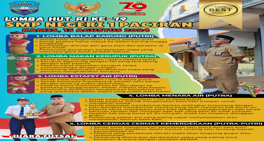 Dalam rangka memperingati Hari Kemerdekaan Republik Indonesia, kami akan mengadakan berbagai perlombaan untuk siswa-siswi SMP Negeri 1 Paciran. Tujuan dari kegiatan ini adalah untuk meningkatkan semangat kebangsaan, kebersamaan, dan sportivitas di kalangan siswa.